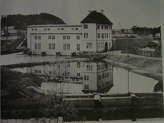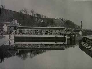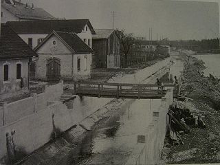 ![]() Der Kraftwerkskanal wird noch 1909 gebaut. Hier mit "Schwoabsteg" bei der Schulstraße. Die Frauen wuschen damals noch die Wäsche in Wassserlauf. |